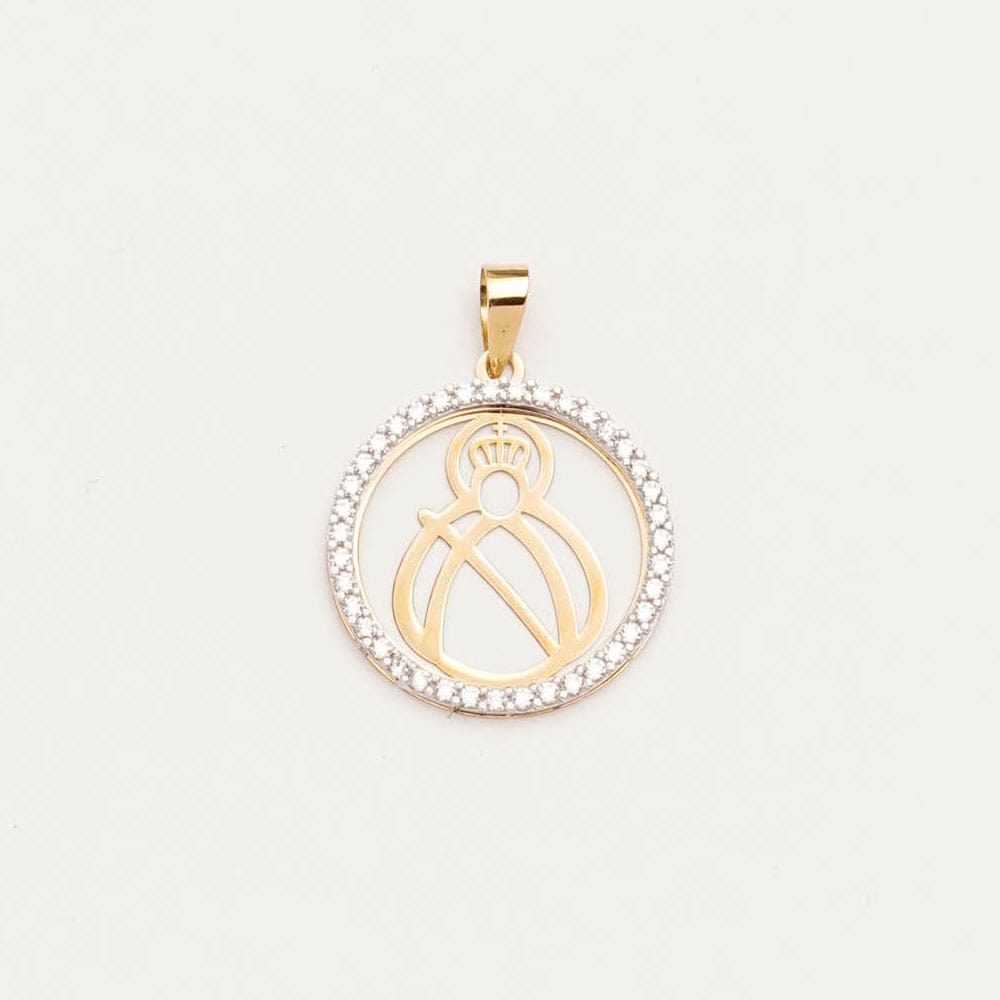 Medalla en oro de 18 kilates de la Virgen de la Cabeza, silueta redonda con bocel en oro blanco con zirconitas.