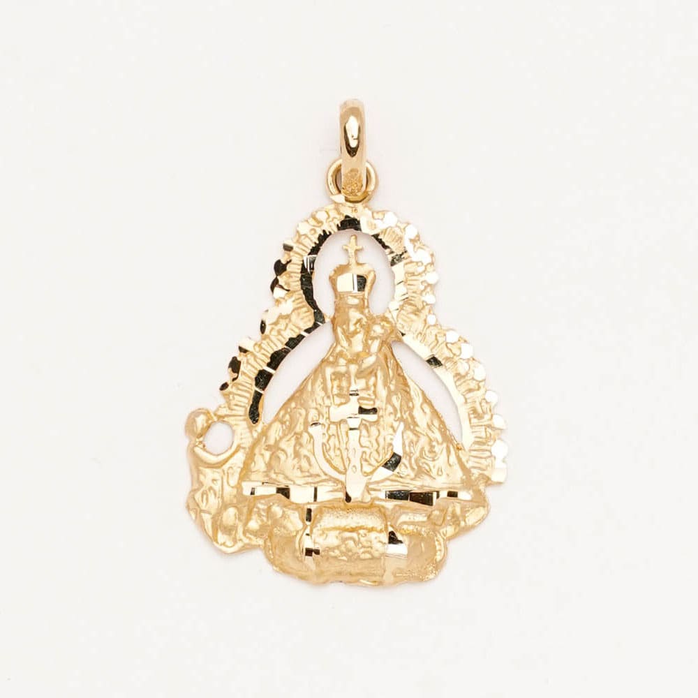 Medalla en oro de 18 kilates, silueta clásica de la Virgen de la Cabeza con el pastor a la izquierda.